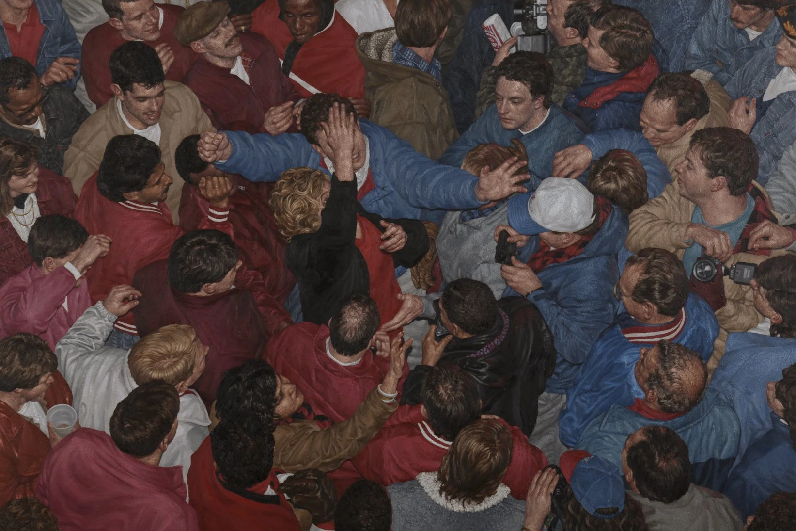 Christopher Murphy’s paintings exist in a space between real and surreal. Murphy’s paintings are a visual representation of the lived experience of recent history. What appears at first glance to be groups of people, upon closer inspection reveals to be the same person repeated in different positions and at different angles. The paintings then become about an inner conversation - about the experience of being within a many-sided monologue.