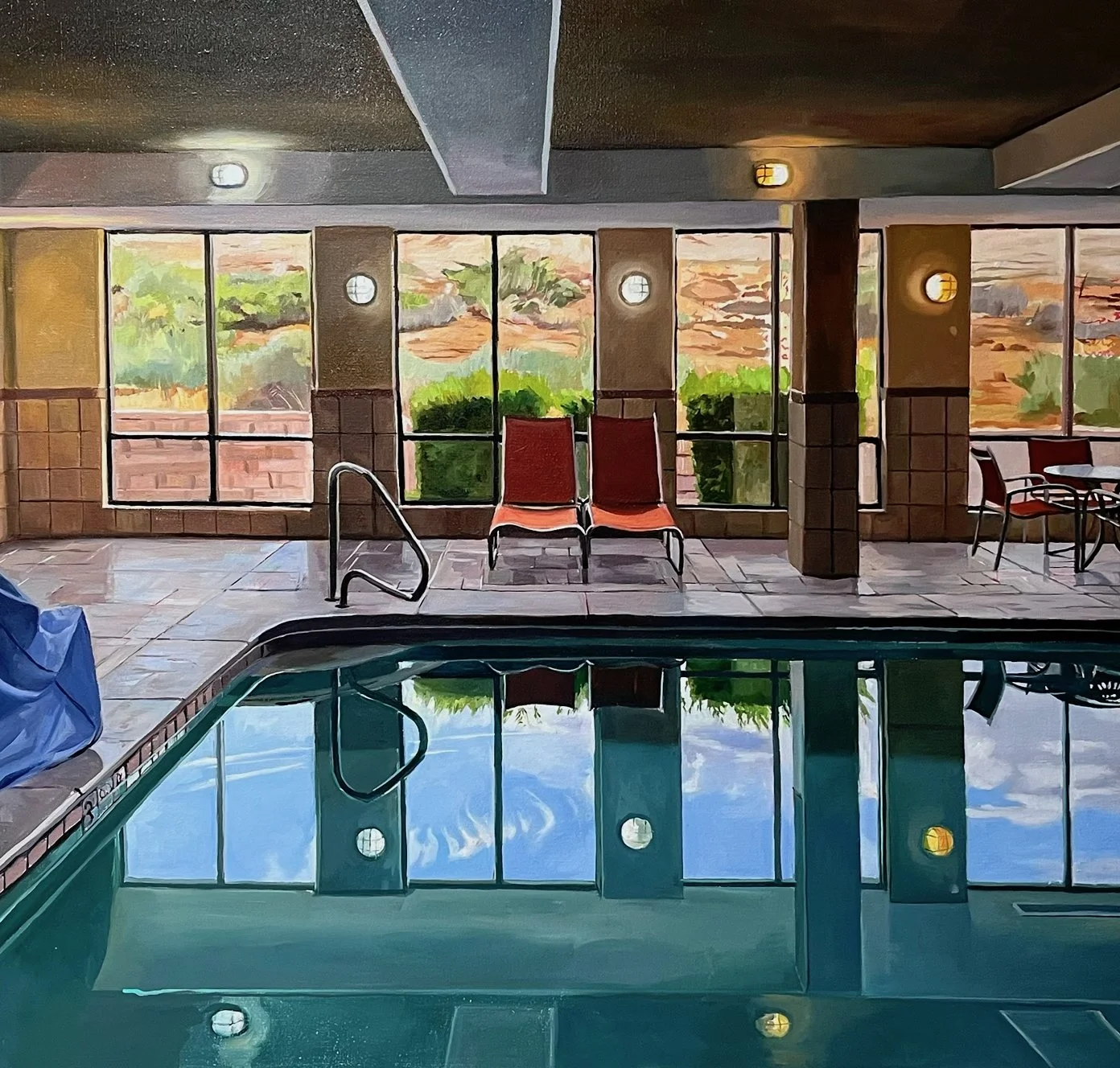 Patricia Chidlaw, Motel Pool with some Mary-Austin Clouds, 2024, oil on canvas, 30x32 in.