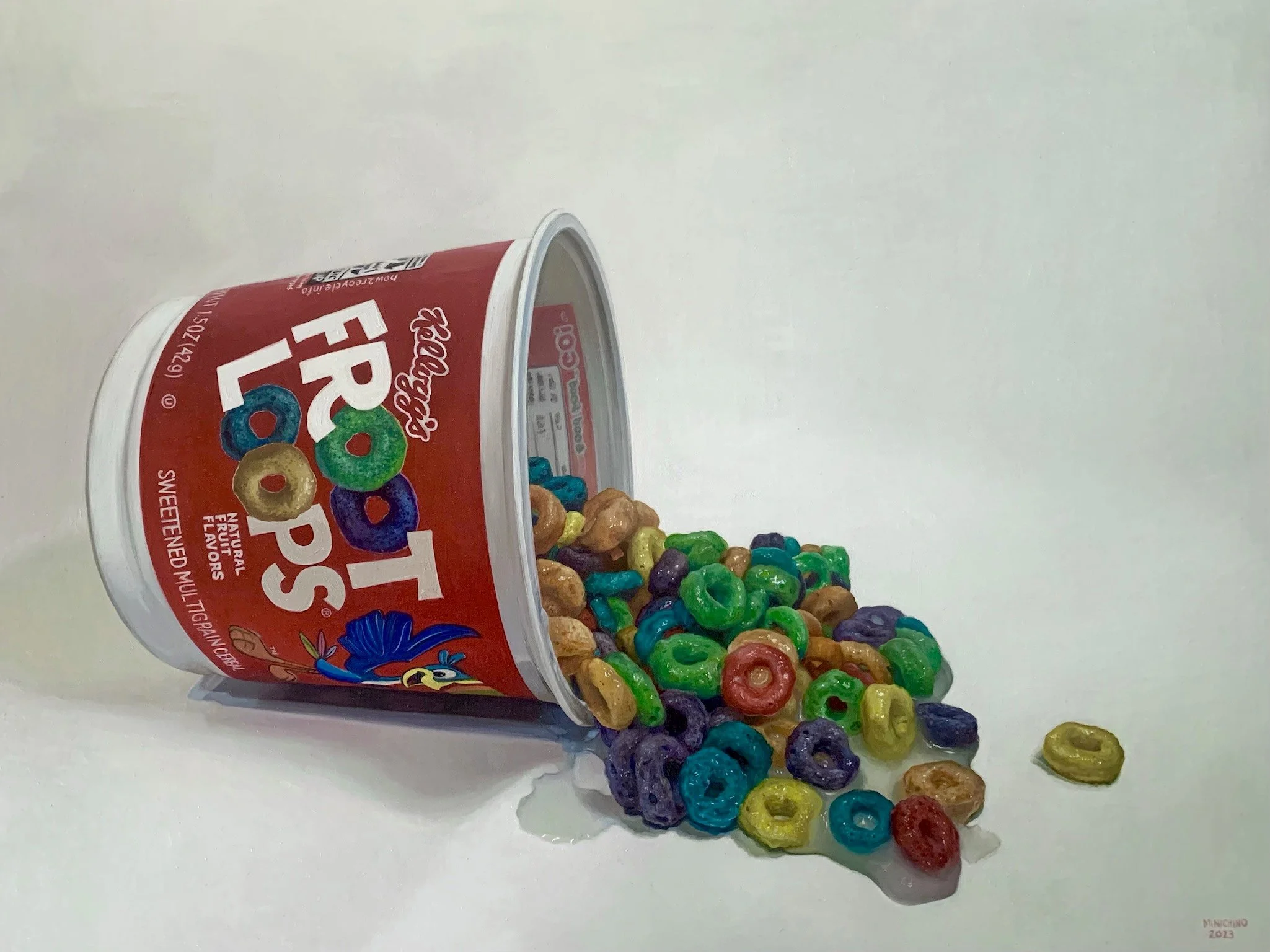 Gina Minichino paints a very modern subject but her paintings are heavily influenced by Dutch and Flemish masters’ use of light and composition. Similarly, Minichino draws on the 17th Century Dutch still life tradition, which depicted food in a way that almost reified it in sumptuous stillness. Minichino’s work has a subdued, almost gothic sense of isolation despite its subject matter which convey a simultaneous sense of both exuberance and loneliness.