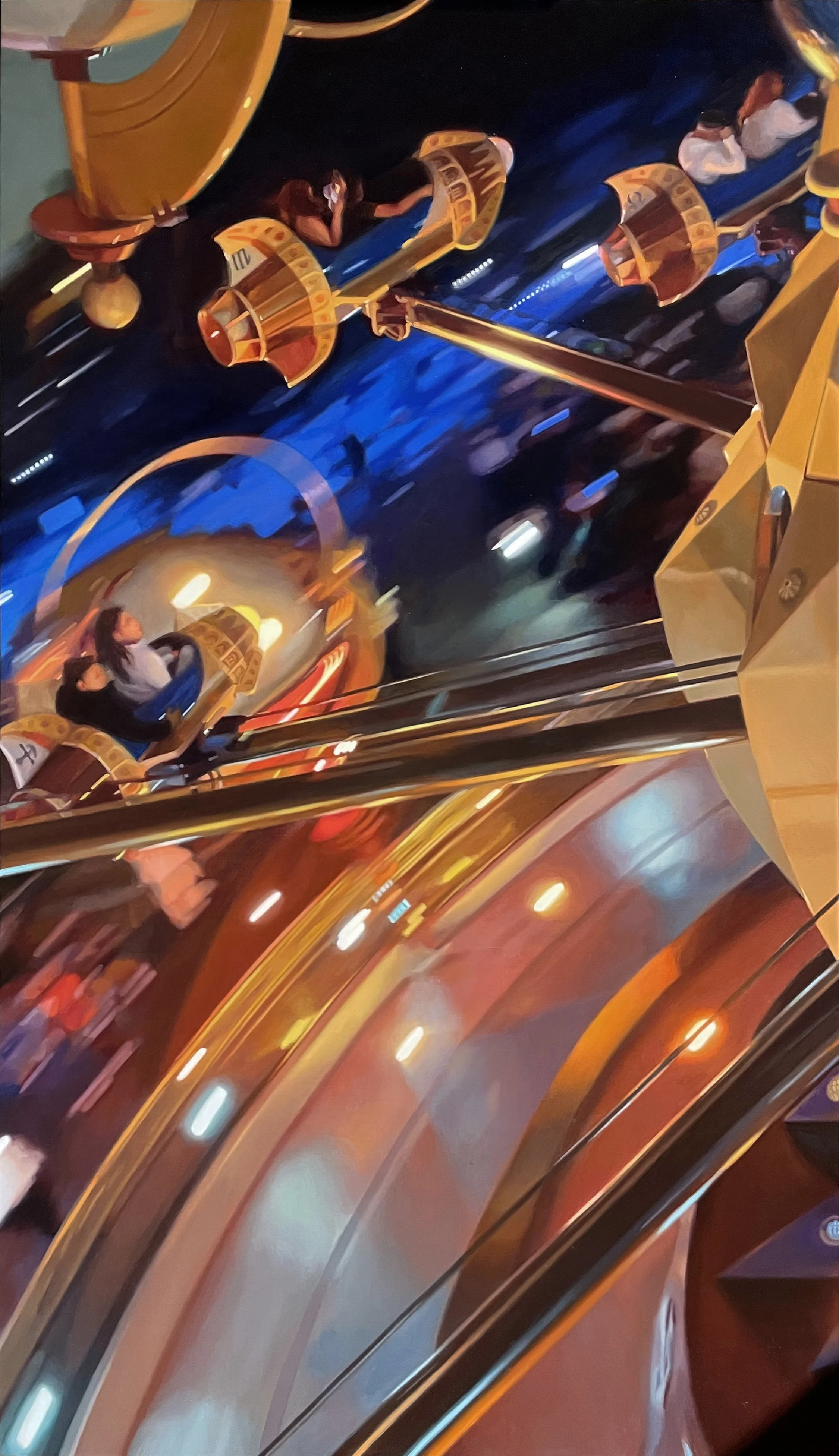 To paint this work, it is necessary to experience the rush, the feel. Shall we call it the sublime? The power of gravity? The excitement mixed with fear as we near the top of the incline. People either love or loathe rollercoasters but they are deeply tied to the idea of escapism - the adrenaline, the rush, the moment.