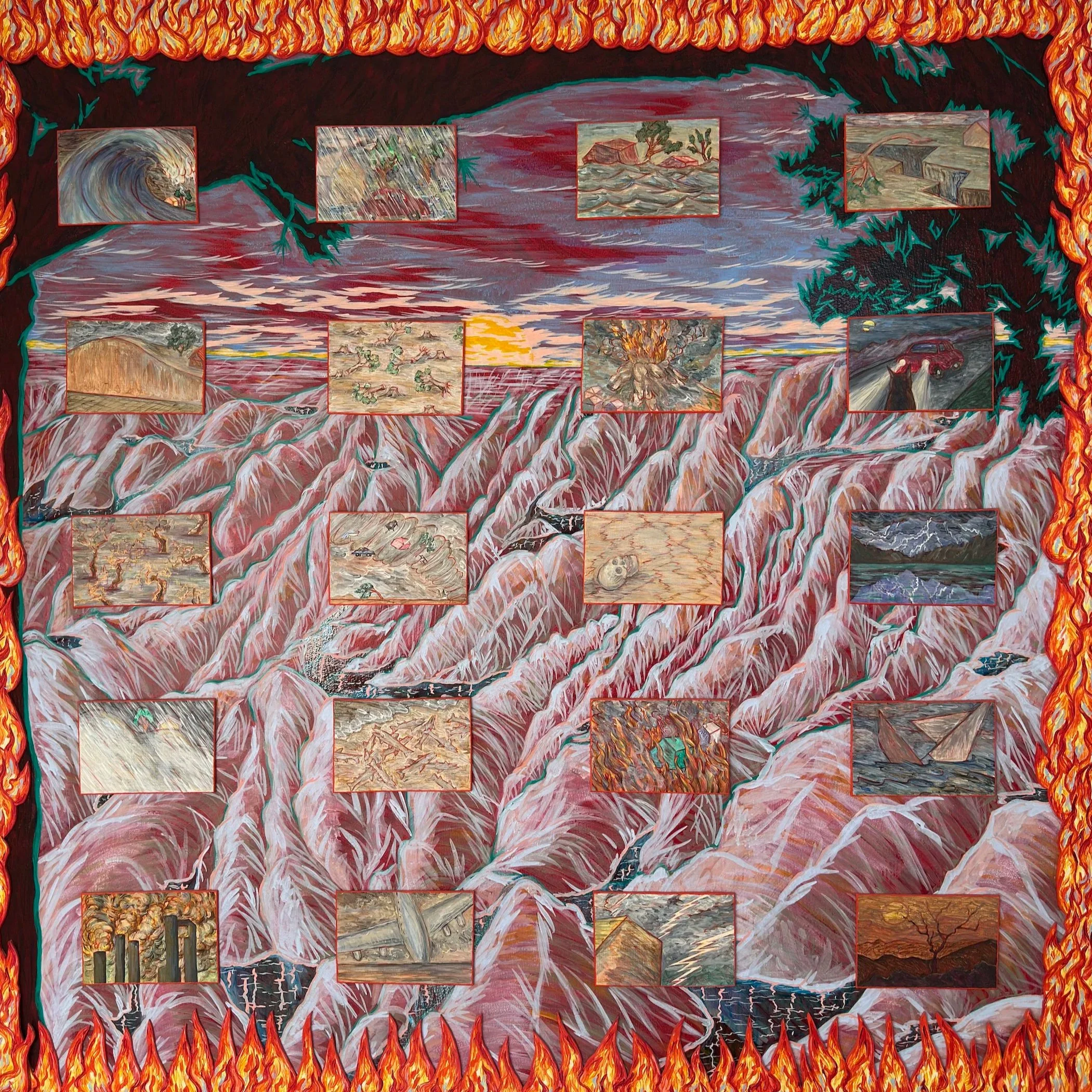 Barbara Strasen’s work seeks to make sense of the inexplicable - she is looking for ways to depict the disordered world in which we find ourselves. What Could Possibly Go Wrong (1987), is part of Strasen’s portraits created through images of different facets of the person she is describing. This spectacular work, featuring hand painted cutout flames around the border, is a tour de force of technical skill, color, and dark wit. The painting is also highly prescient of today's complicated times - the fires in Los Angeles, the current political climate, environmental issues, and social unrest.