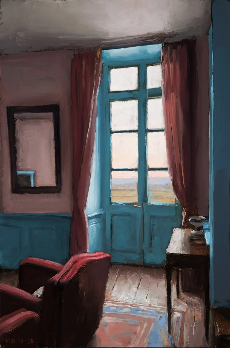 Kenny Harris, Interior At Twilight, Normandy, 2010-2025, oil on panel, 12x8 in., $ 2,200