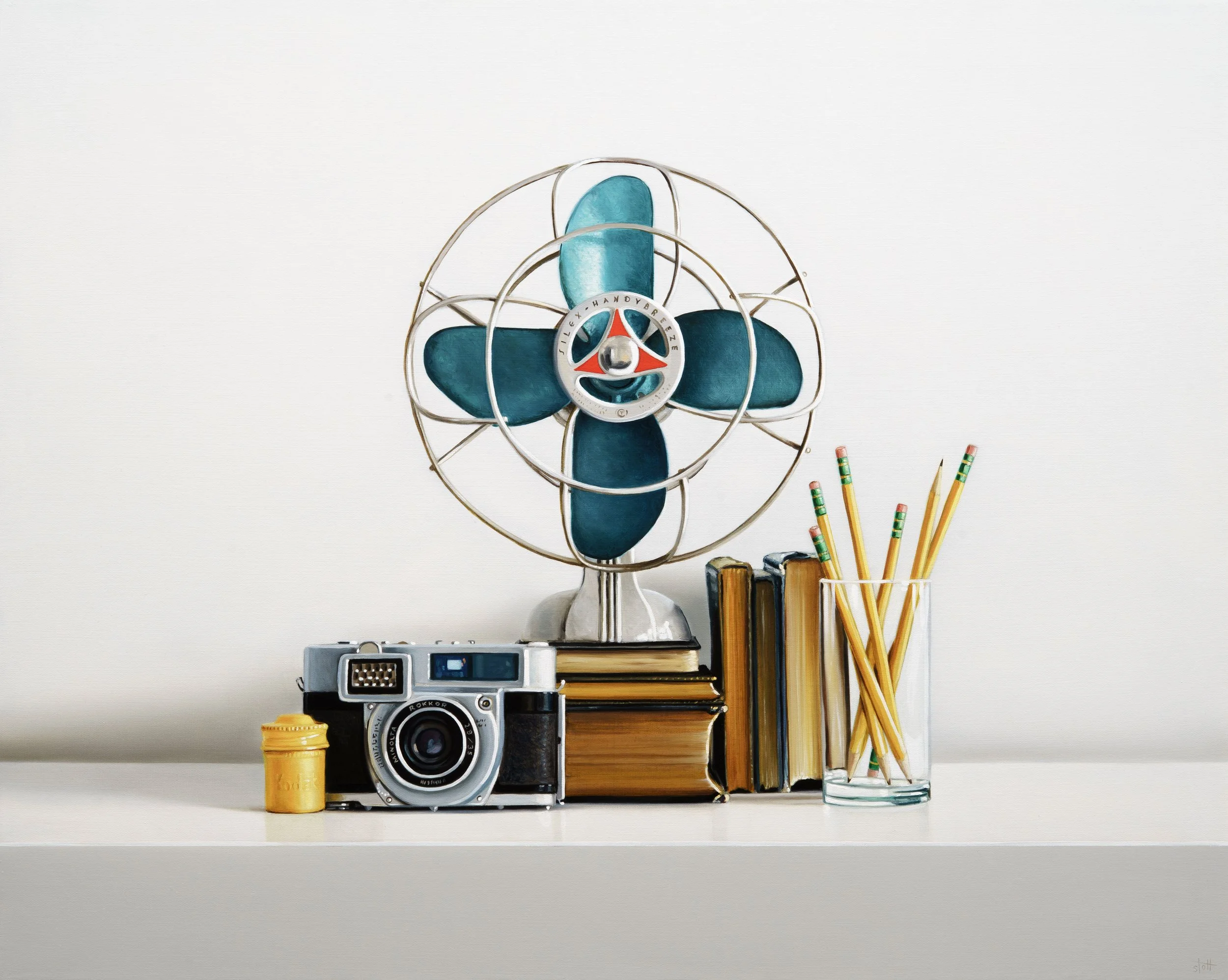 Christopher Stott, 1958 Minolta Autowide Camera and Fan, 2025, oil on canvas, 24x30 in., $5,600