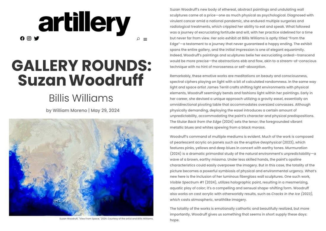 Suzan Woodruff: Back from the Edge opens Saturday, May 11, 4-7pm at Billis Williams Gallery. As a painter Suzan Woodruff has always been attracted to the edges—of things, of knowledge, of poetry and spirit, of darkness and light, in places where the earth and sea and sky meet, and places where fire and ice touch, geologically and metaphorically. Her painstakingly engineered yet foundationally intuitive abstract compositions echo and express a state of perpetual, universal liminality, enacting in pigment and motion the phenomenological cavortings of her terrestrial and celestial muses. But in the past few years, the edges she has explored have come to include silence and battle, faith and despair, and even, quite literally life and death. Like many cosmonauts of the soul before her, and also like many painters who have pushed and tested the limits of what their materials (and bodies) can endure, she’s back from the edge with intensely energetic, richly surfaced captures of the barely controlled, impossibly beautiful chaos that’s unfurling out there at this very moment. On view in Culver City through June 8; free; billiswilliams.com.