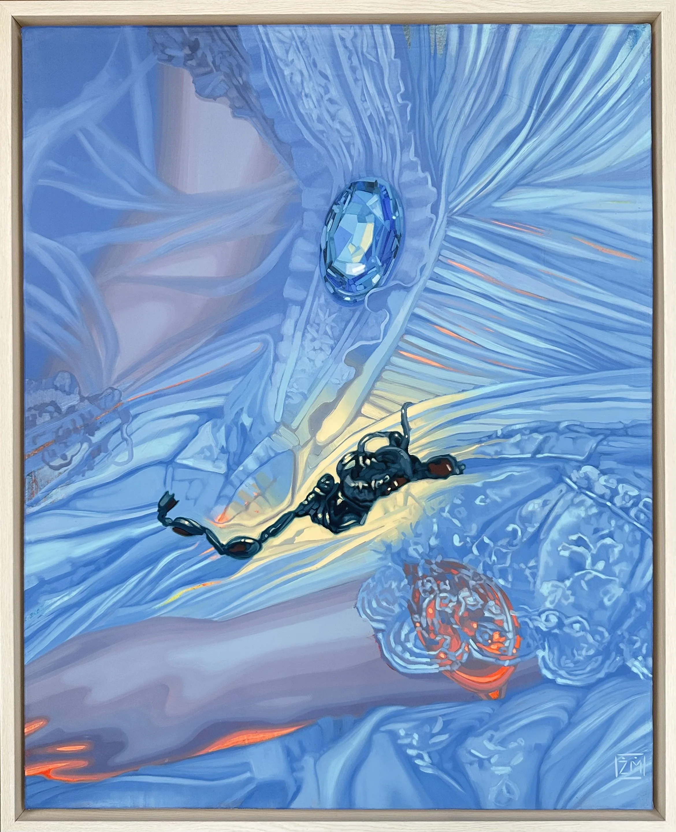Zara Monet’s paintings are gloriously opulent and alluring - rich satin gowns, delicate lace edging, a string of pearls, all punctuated by extravagantly oversized jewels. These historically and iconically feminine accouterments (ruffles and circle skirts and corseted bodices) are beautifully compelling but without telling the whole story. The jewels become almost like armor or a shield - a diversion or misdirection to obscure the truth. Dreamlike and romantic, the paintings are a nod to classical portraits in their formal qualities but somehow unmoored in time. They are not past nor are they present.